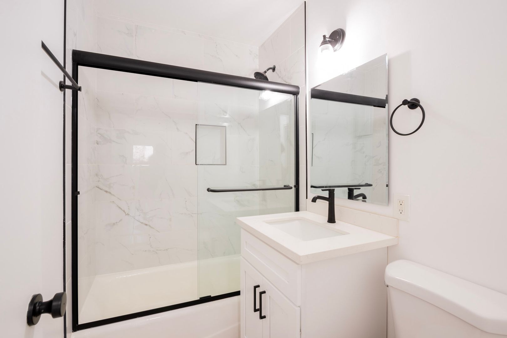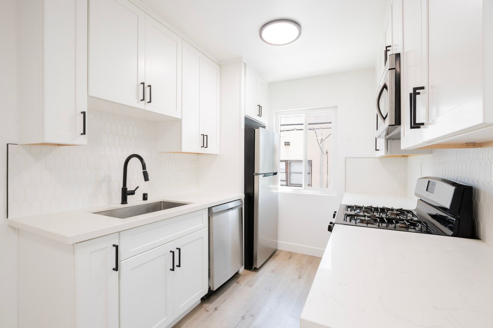 Step inside to discover a thoughtfully designed open layout featuring new flooring, designer lighting, and abundant natural light. The contemporary kitchen boasts black-finish stainless steel appliances—including stove, microwave, dishwasher, and refrigerator—along with sleek cabinetry and quartz countertops.