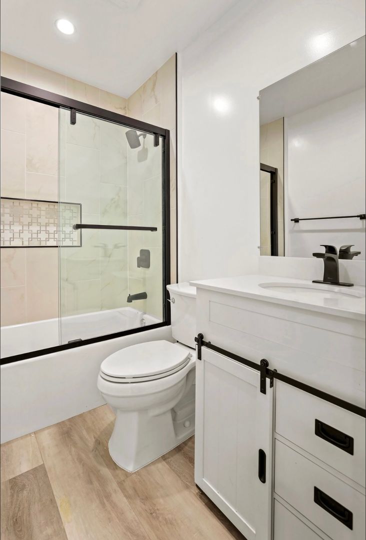 | BATH | - Tiled Shower and Bath - Glass Shower Doors - Oversized Vanity Mirror