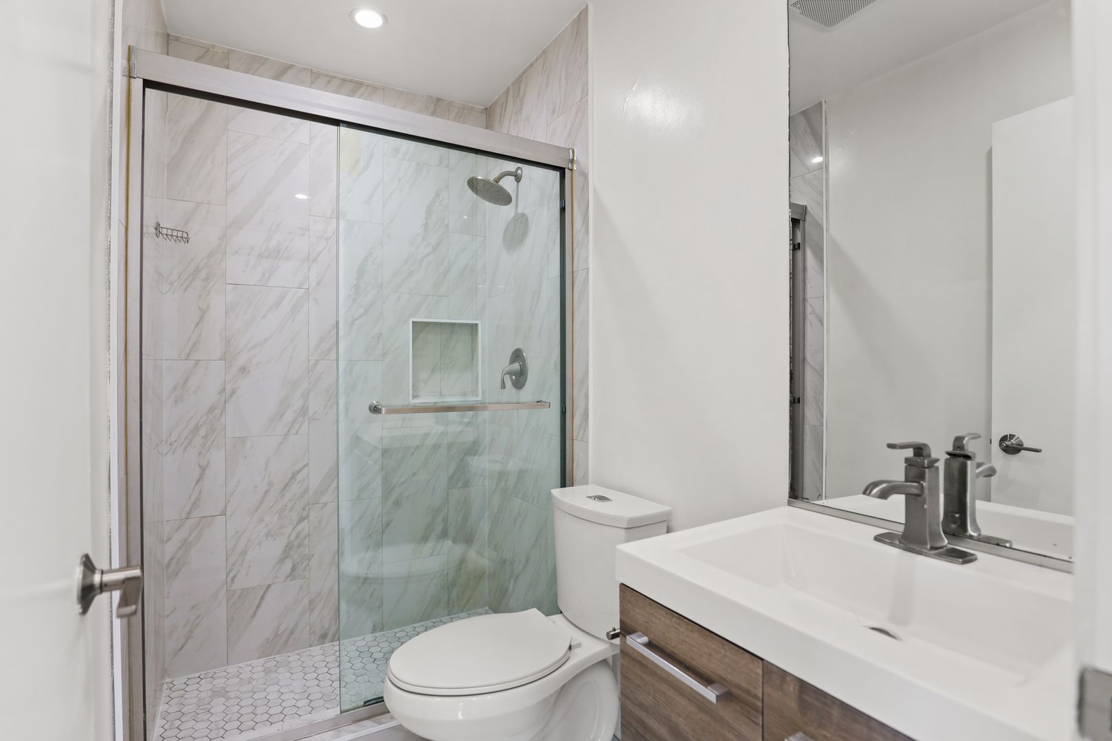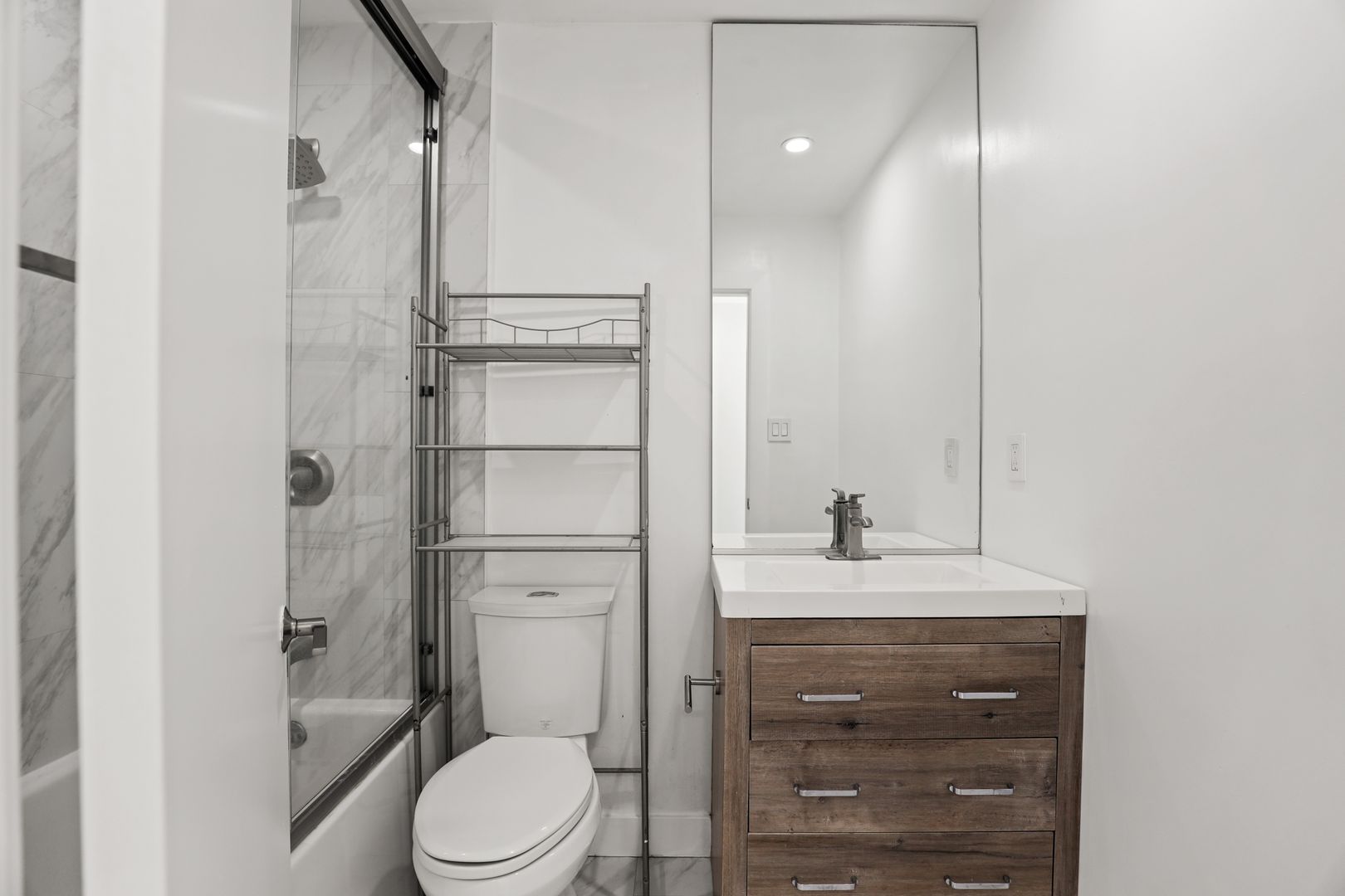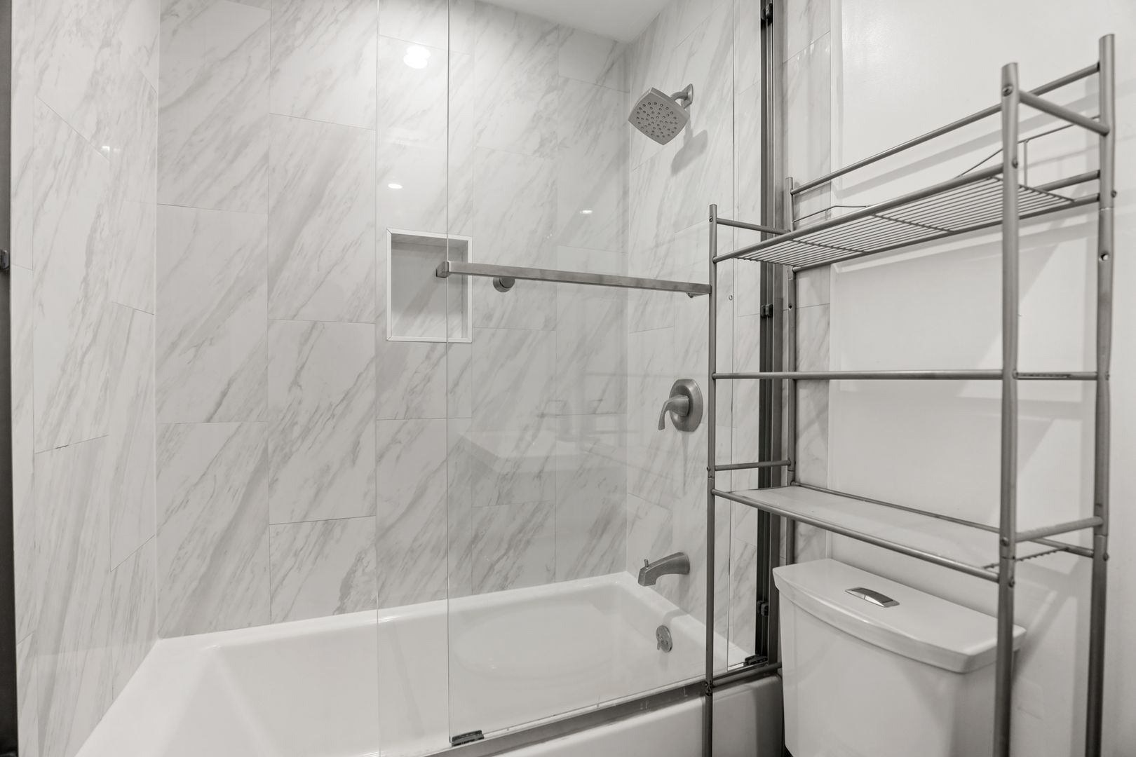 | BATH | - Tiled Shower and Bath - Glass Shower Doors - Oversized Vanity Mirror