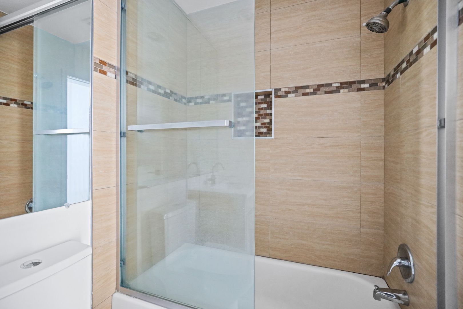 BATHROOM : Tiled Shower and Bath - Glass Shower Doors - Oversized Vanity Mirror