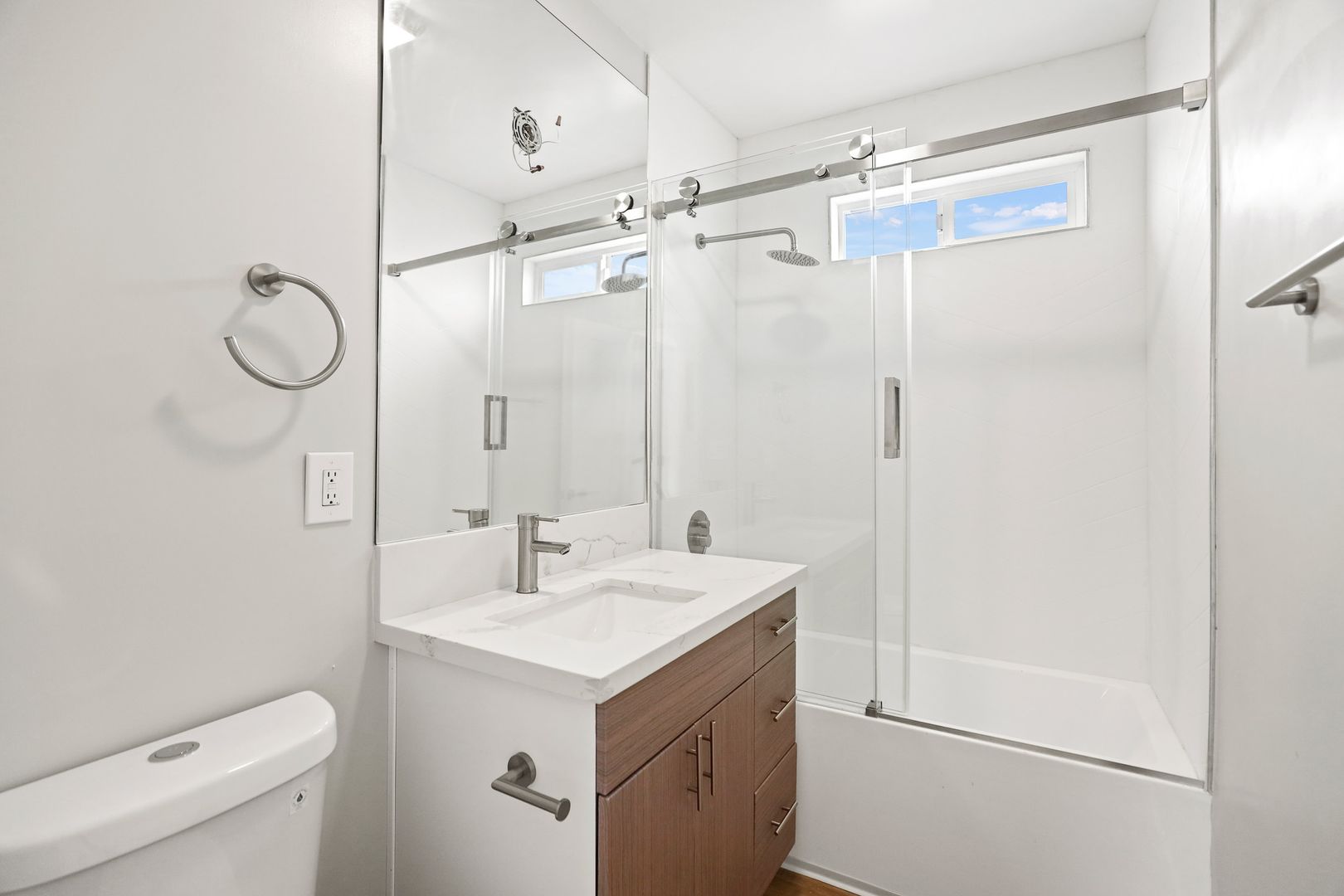| BATH | - Tiled Shower and Bath - Glass Shower Doors - Oversized Vanity Mirror