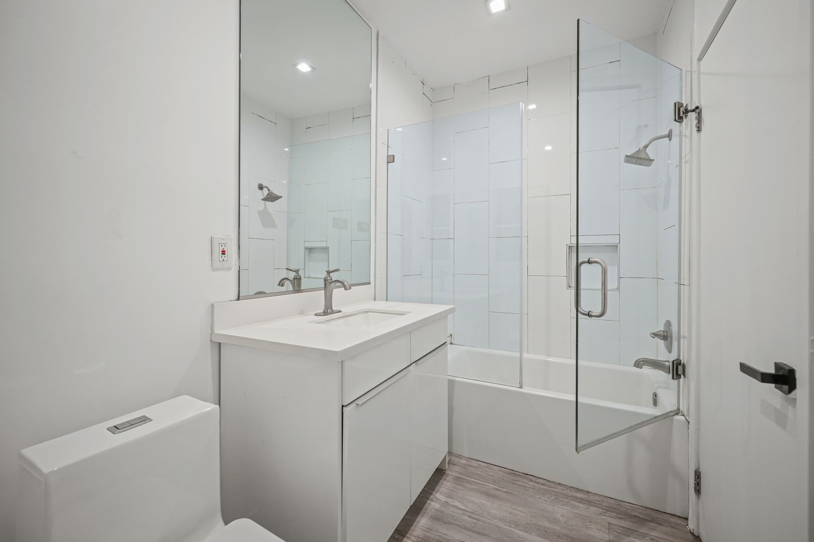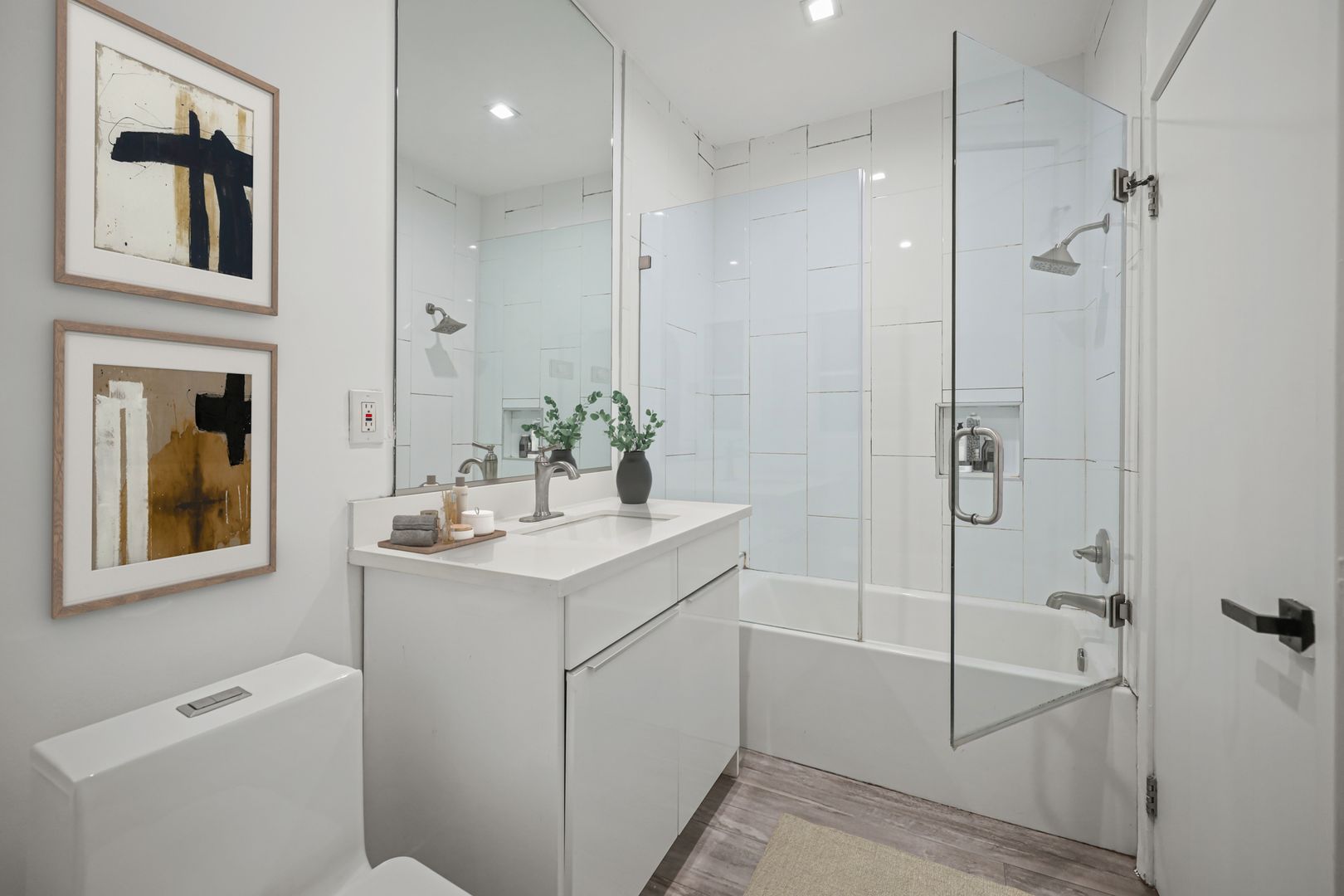 BATHROOM : Tiled Shower and Bath - Glass Shower Doors - Oversized Vanity Mirror