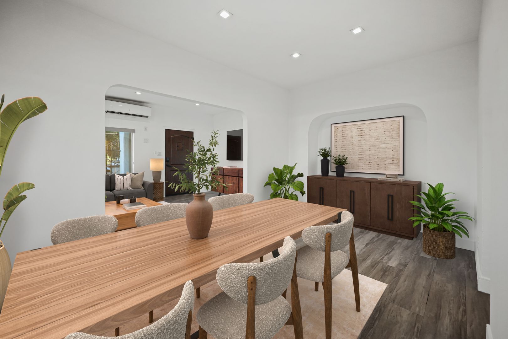 Carefully restored and designed by a renowned LA designer, these 1930s vintage luxury rental homes feature keyless entry door locks to spacious one bedroom and two-bedroom floor plans with arched entry ways to newly renovated kitchen and bathrooms. The kitchen boasts sparkling white stone quartz countertops with brand new self-closing cabinetry and high-end Samsung stainless-steel refrigerators with matching gas cooktop with oven and microwave. Inside each rental home with porcelain tiled bathtubs, and glass shower doors and separate guest bathrooms. Each rental homes also includes central A/C cooling and heating with recessed lights with luxury style remote control blinds and distressed wood plank floors.