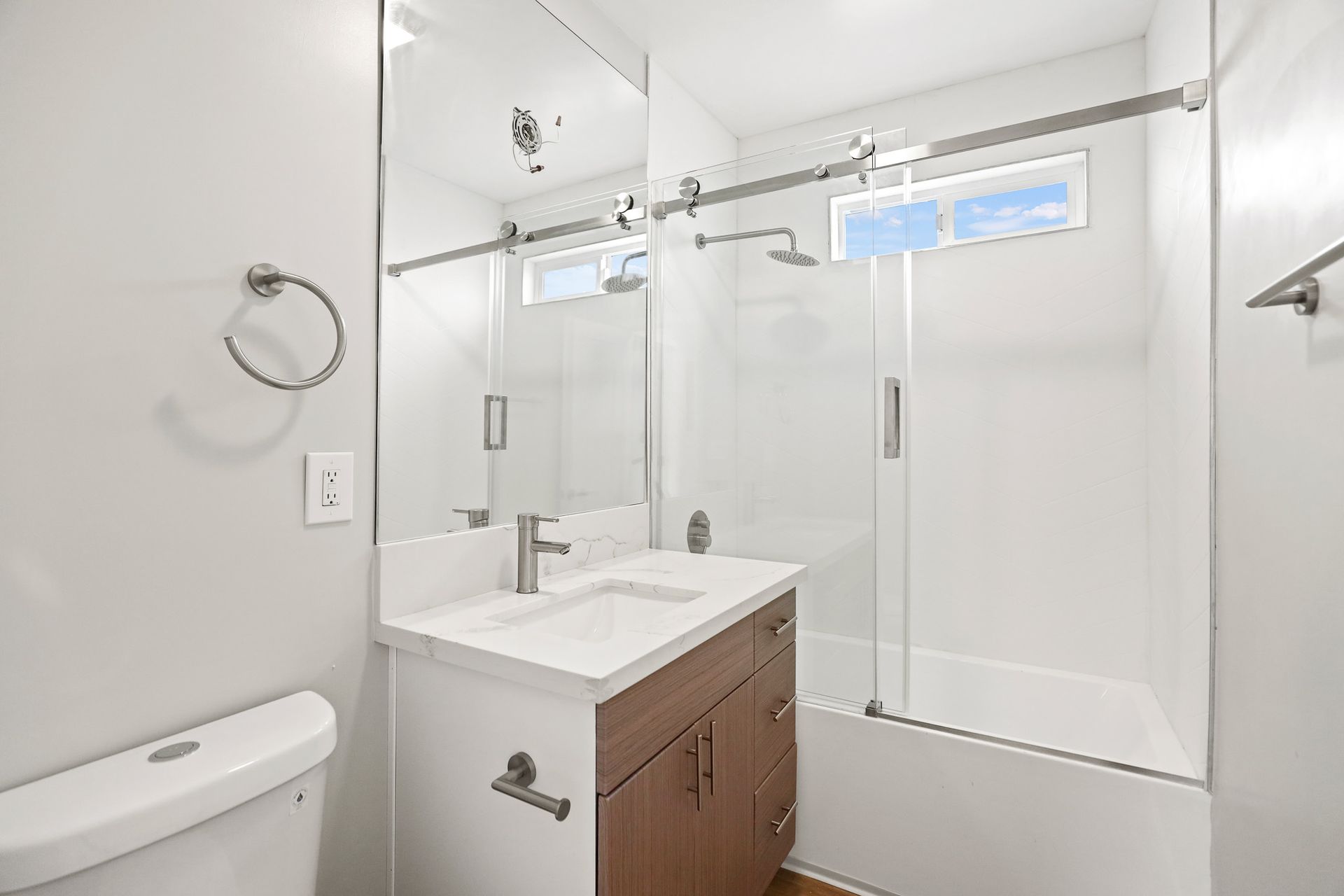 | BATH | - Tiled Shower and Bath - Glass Shower Doors - Oversized Vanity Mirror