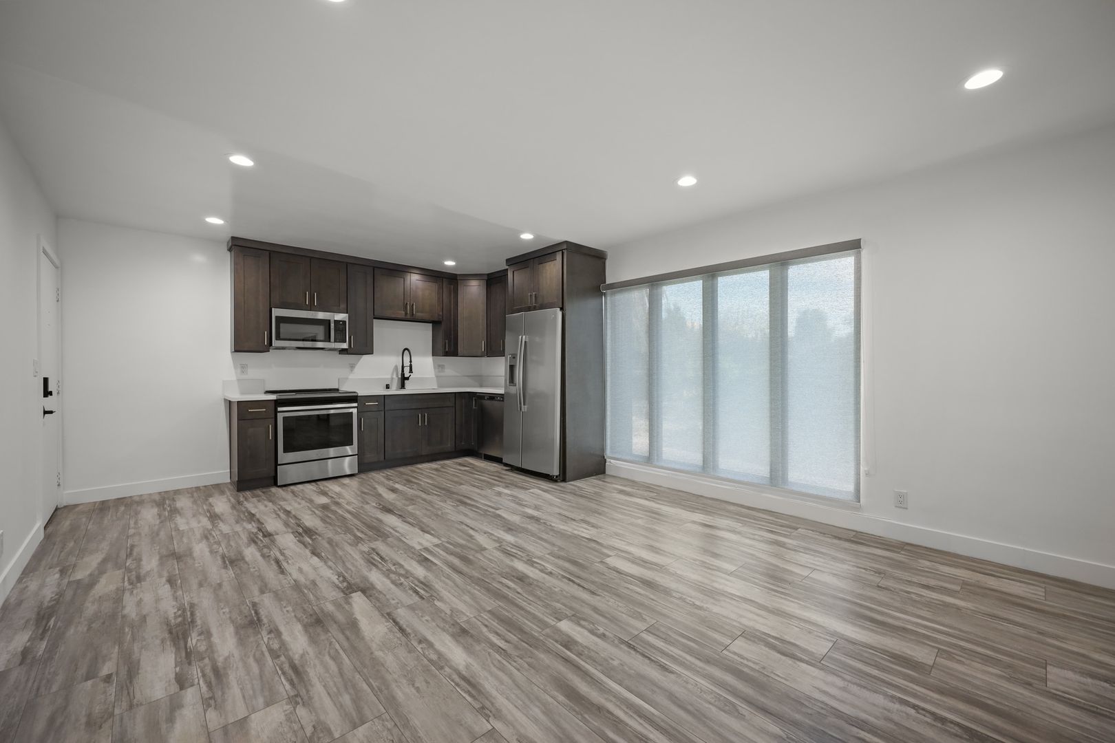 Carefully restored and designed by a renowned LA designer, these 1960s modern luxury rental homes feature keyless entry door locks to spacious one and two-bedroom floor plans with newly renovated kitchen and bathrooms. The kitchen boasts sparkling white stone quartz countertops with brand new self-closing cabinetry and high-end stainless-steel refrigerators with matching gas cooktop with oven and microwave. iRing doorbells with a smart home video security camera are also included as well as a community washer and dryer room. Bathrooms feature porcelain tiled bathtubs and glass shower doors. Each rental home also includes recessed lights & luxury style cellular shade window blinds and distressed wood plank floors.