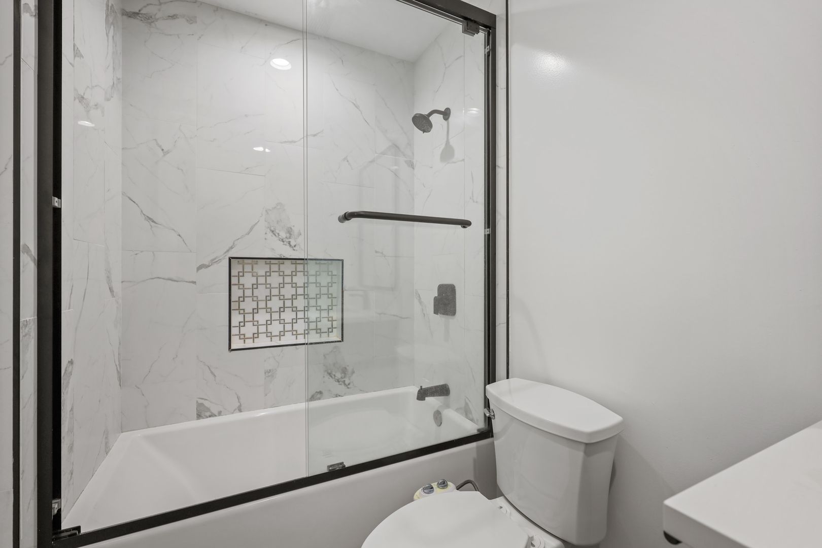| BATH | - Tiled Shower and Bath - Glass Shower Doors - Oversized Vanity Mirror