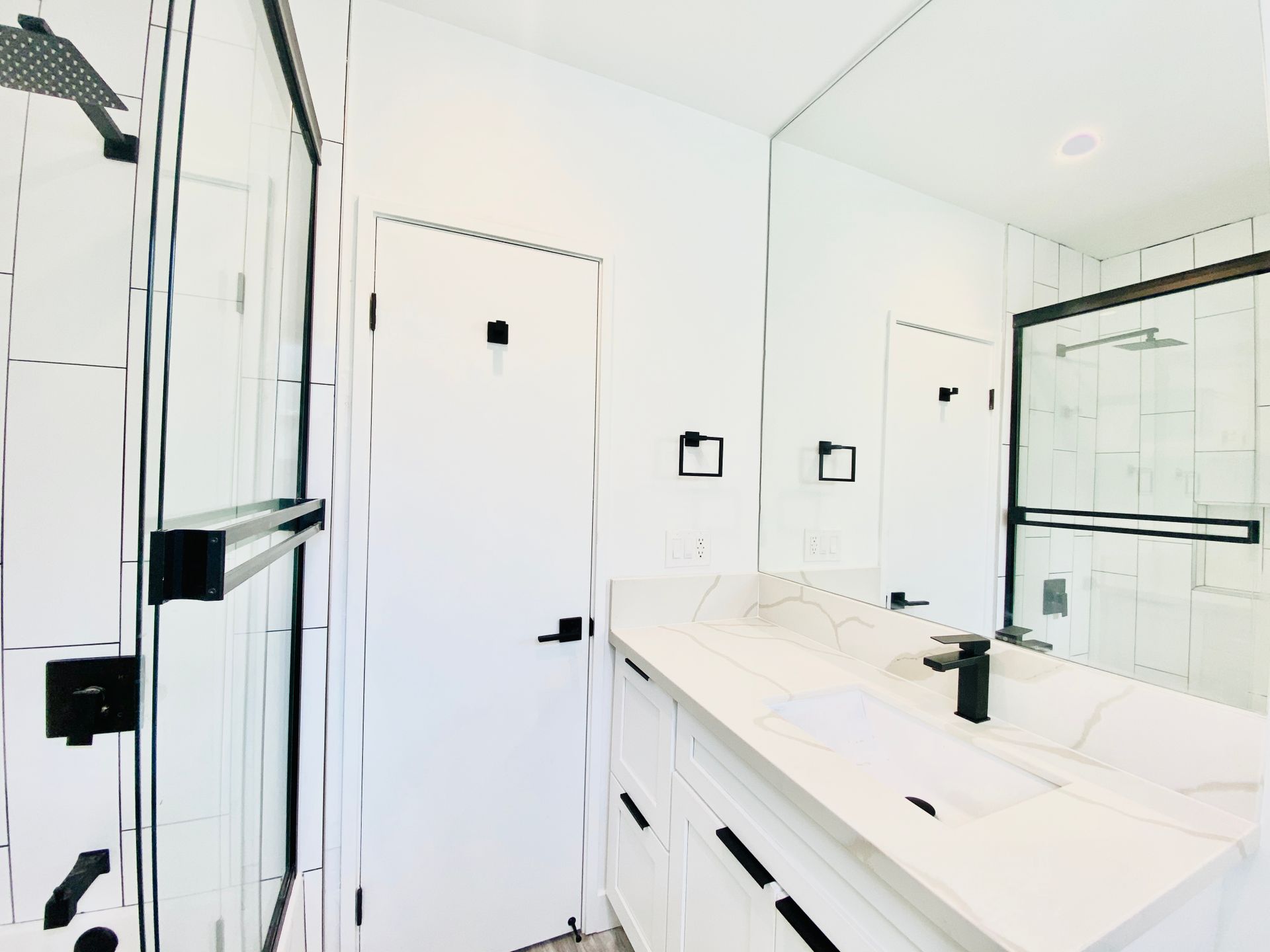 | BATH | - Tiled Shower and Bath - Glass Shower Doors - Oversized Vanity Mirror