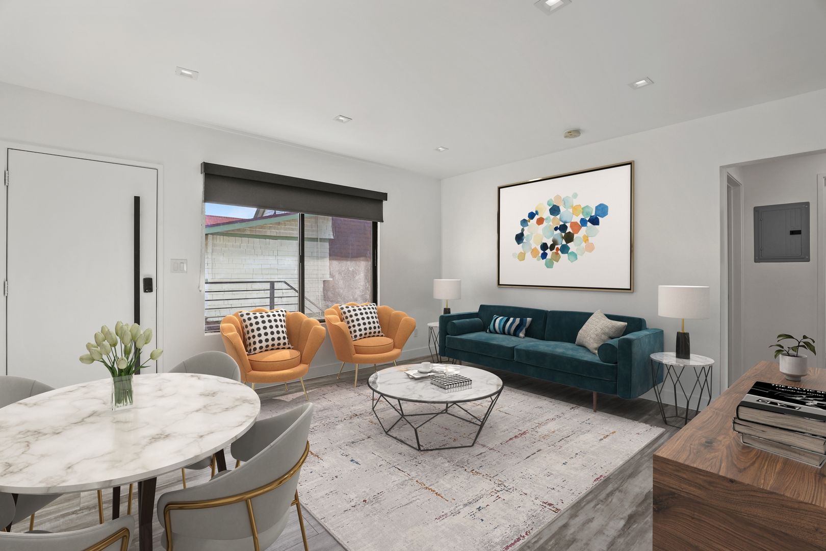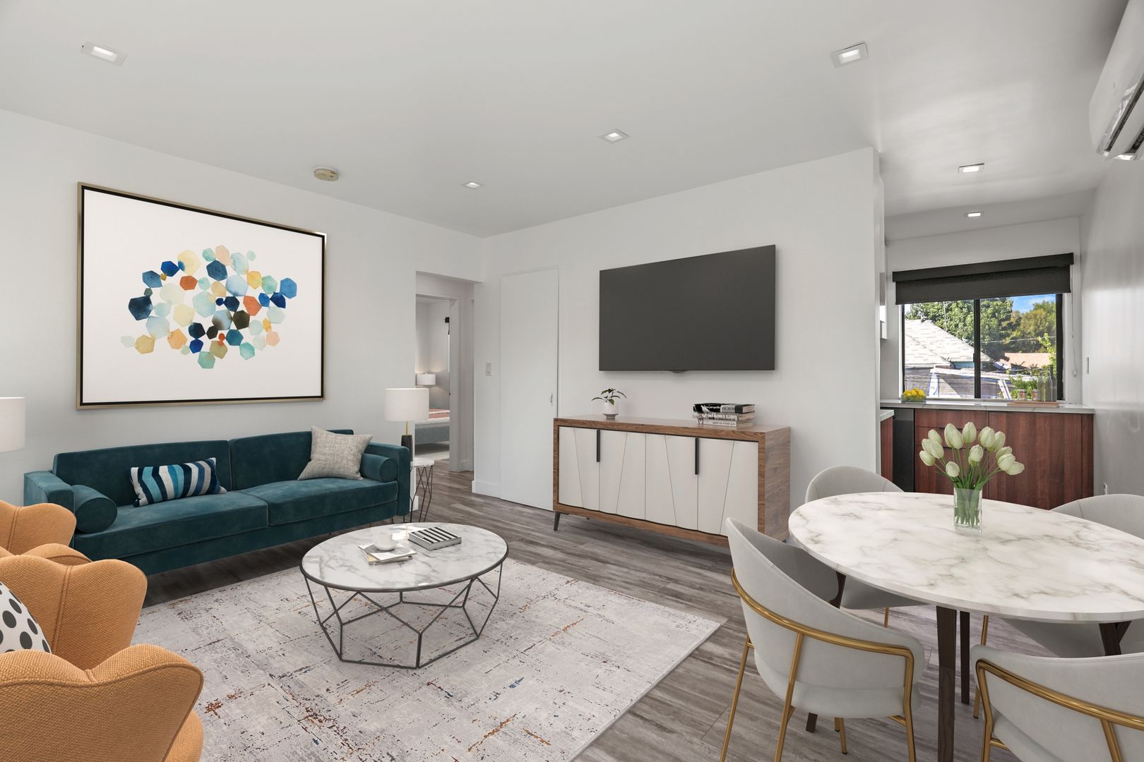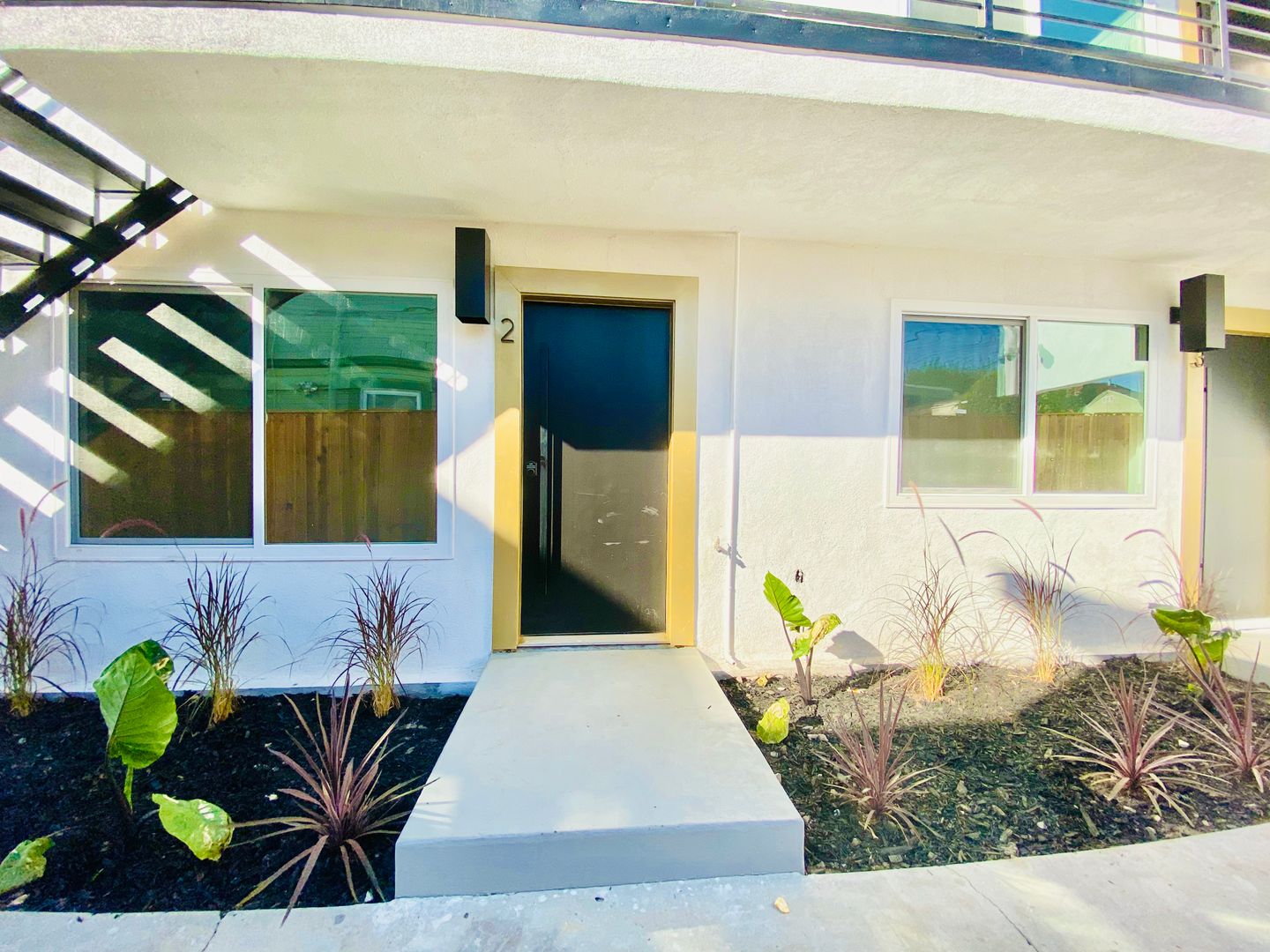 Carefully restored and designed by a renowned LA designer, these 1960s modern luxury rental homes feature keyless entry door locks to spacious one and two-bedroom floor plans with newly renovated kitchen and bathrooms. The kitchen boasts sparkling white stone quartz countertops with brand new self-closing cabinetry and high-end stainless-steel refrigerators with matching gas cooktop with oven and microwave. iRing doorbells with a smart home video security camera are also included as well as a stackable washer and dryer. Bathrooms feature porcelain tiled bathtubs and glass shower doors. Each rental home also includes central A/C cooling and heating w/ recessed lights & luxury style cellular shade window blinds and distressed wood plank floors.