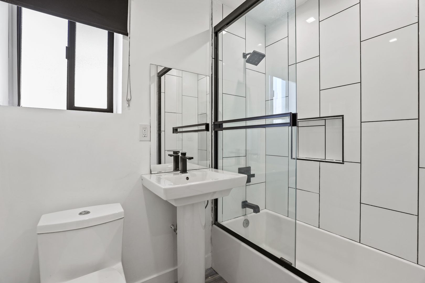 | BATH | - Tiled Shower and Bath - Glass Shower Doors - Oversized Vanity Mirror