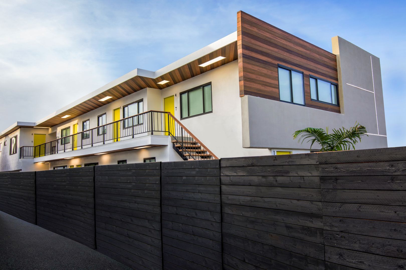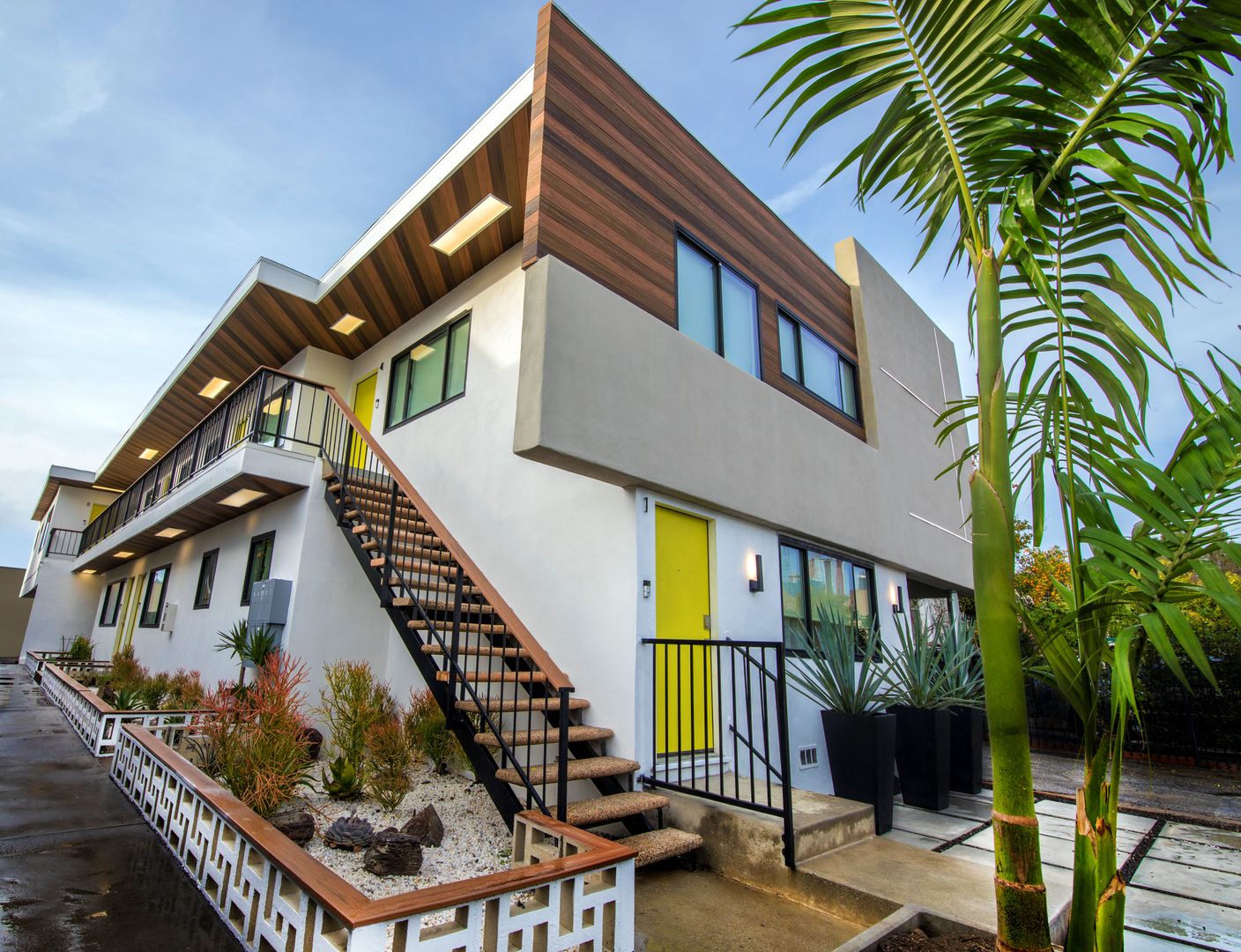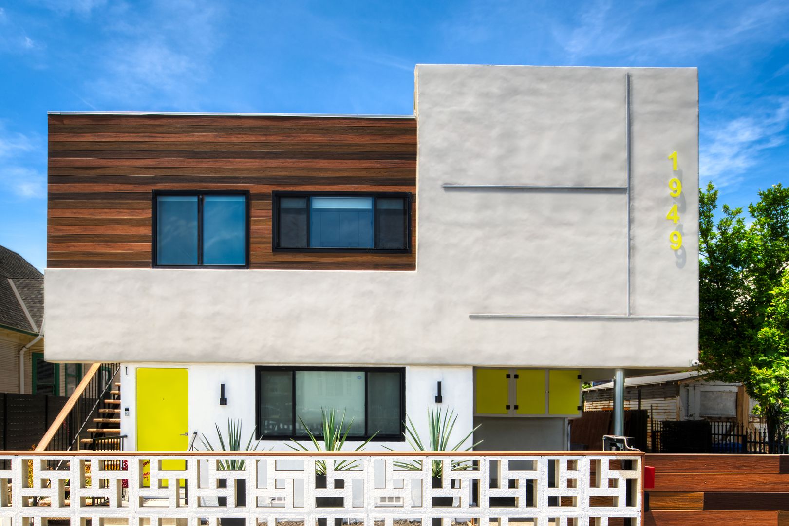 Inspired by midcentury Modernism architecture, these newly renovated rental homes are just minutes to the prestigious University of Southern California (USC) and thriving Downtown Los Angeles. 1949 Park Grove, located in the heart of central Los Angeles, features a nine-unit, two-story low-rise building with enhanced modern architecture and a gray cement shade base and accents of earth tone colors.