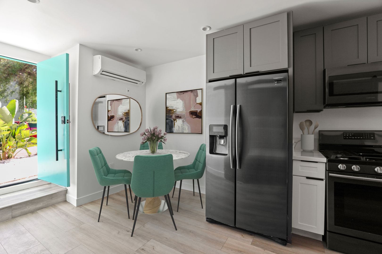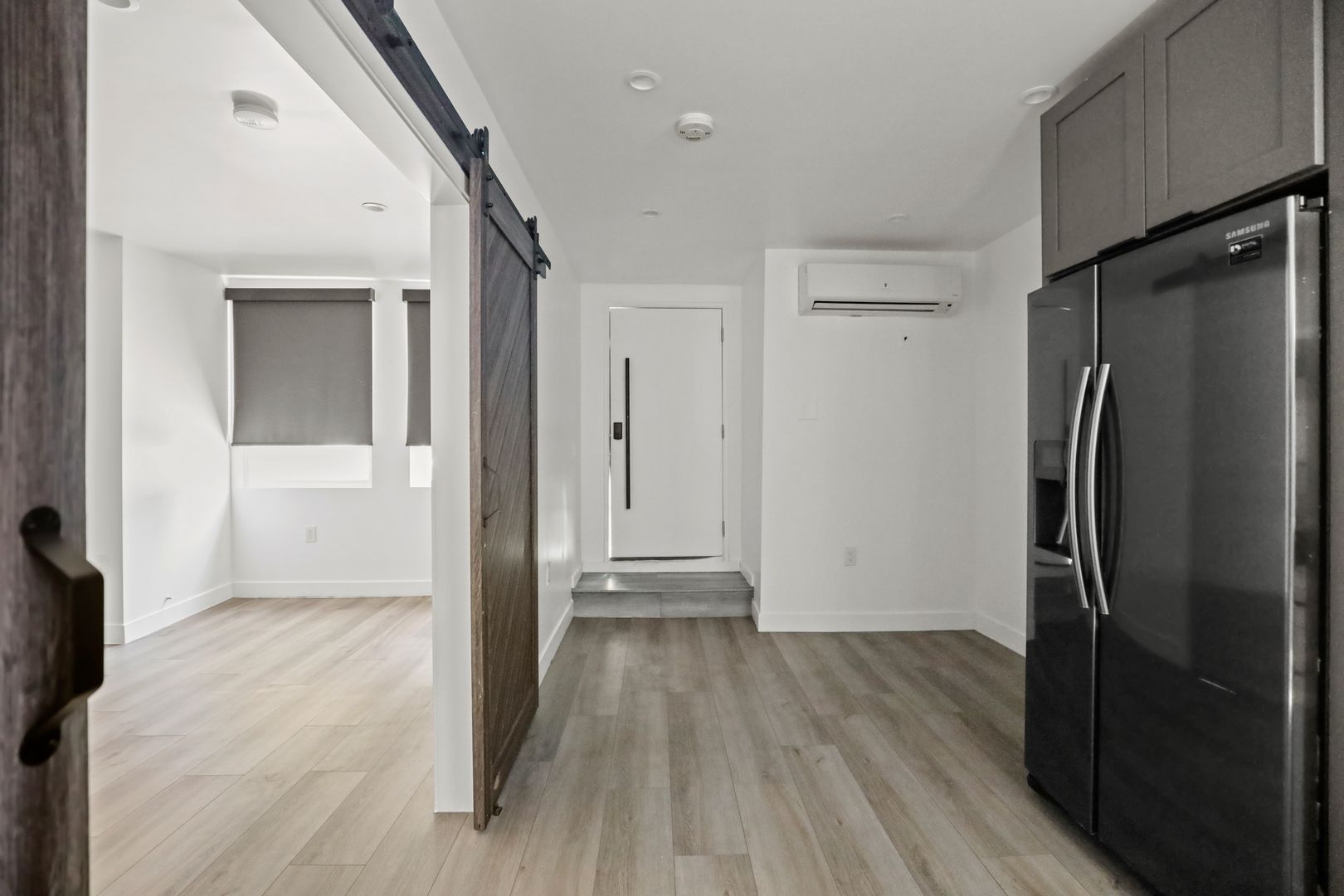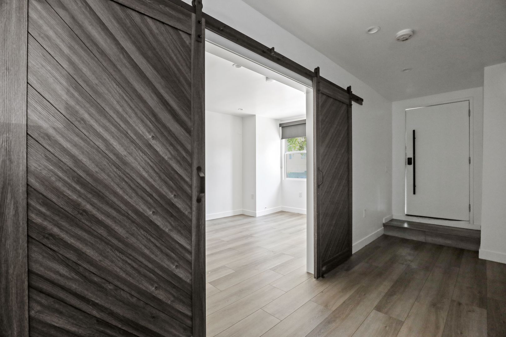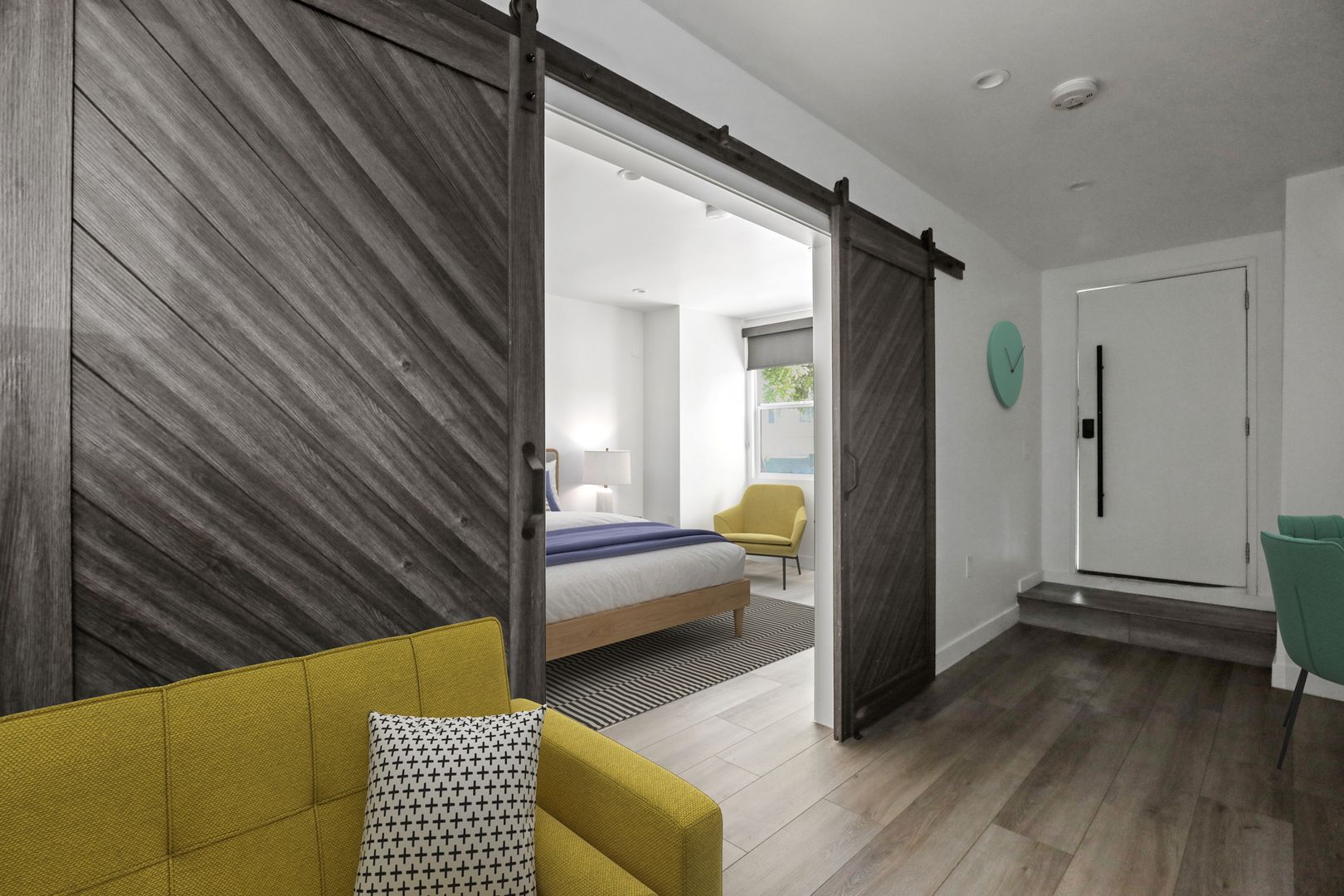 Carefully restored and designed by a renowned LA designer, these 1920s modern rental homes feature keyless entry door locks to spacious two-bedroom floor plans with new kitchens and bathrooms. The kitchen boasts sparkling white stone quartz countertops with brand new self-closing cabinetry and high-end stainless-steel refrigerators with matching gas cooktop with oven and microwave. iRing doorbells with a smart home video security camera are also included. Bathrooms feature porcelain tiled bath tubs and glass shower doors. Each rental home also includes central A/C cooling and heating with recessed lights with luxury style cellular shade window blinds, distressed wood plank floors, and dual sliding barn doors.
