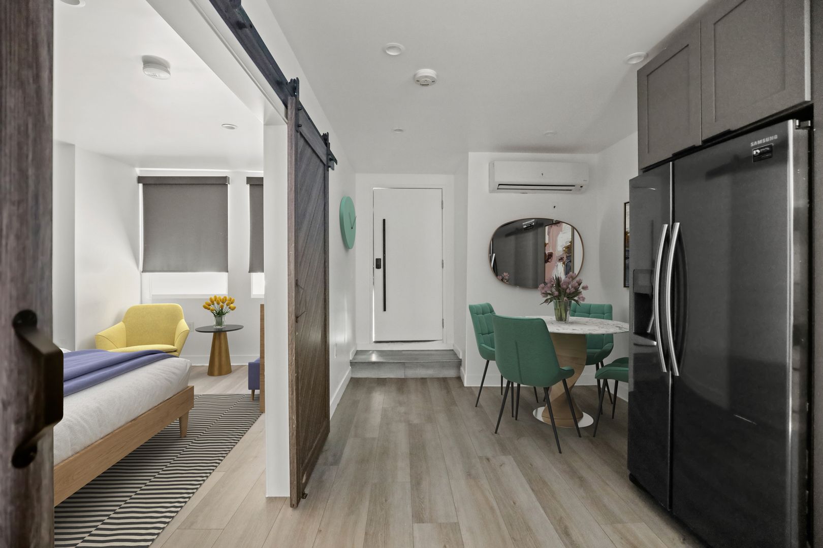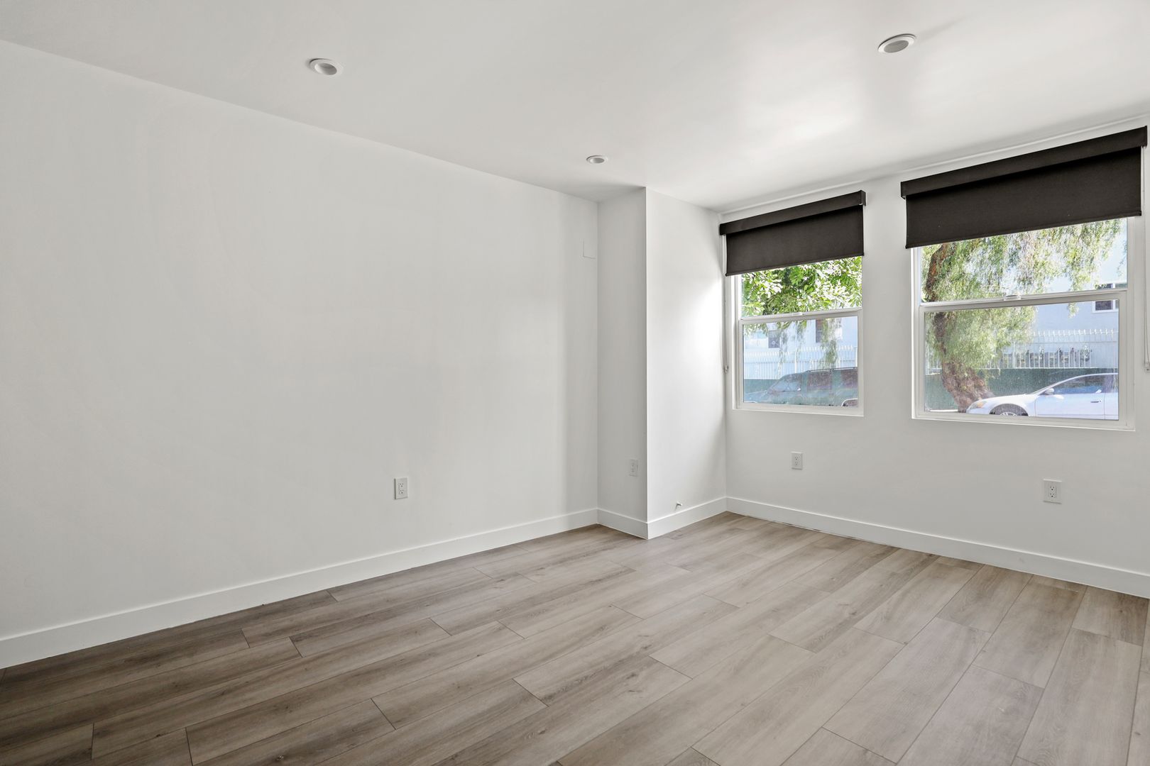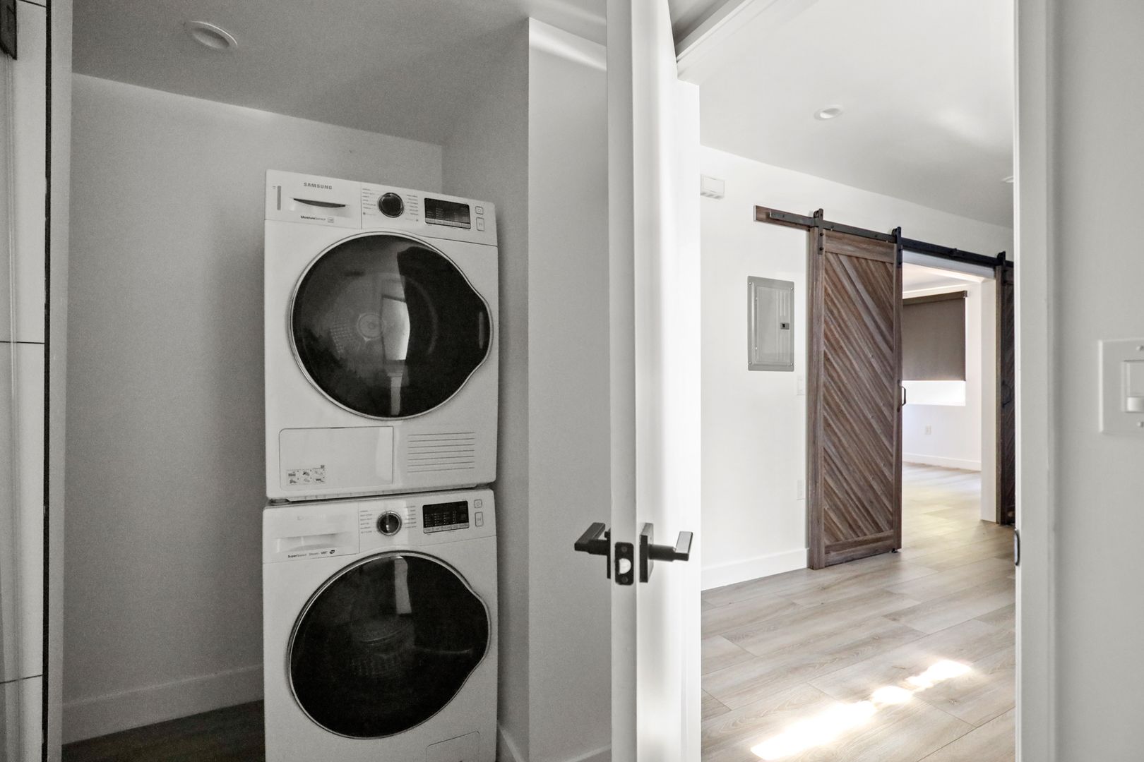 Carefully restored and designed by a renowned LA designer, these 1920s modern rental homes feature keyless entry door locks to spacious two-bedroom floor plans with new kitchens and bathrooms. The kitchen boasts sparkling white stone quartz countertops with brand new self-closing cabinetry and high-end stainless-steel refrigerators with matching gas cooktop with oven and microwave. iRing doorbells with a smart home video security camera are also included. Bathrooms feature porcelain tiled bath tubs and glass shower doors. Each rental home also includes central A/C cooling and heating with recessed lights with luxury style cellular shade window blinds, distressed wood plank floors, and dual sliding barn doors.