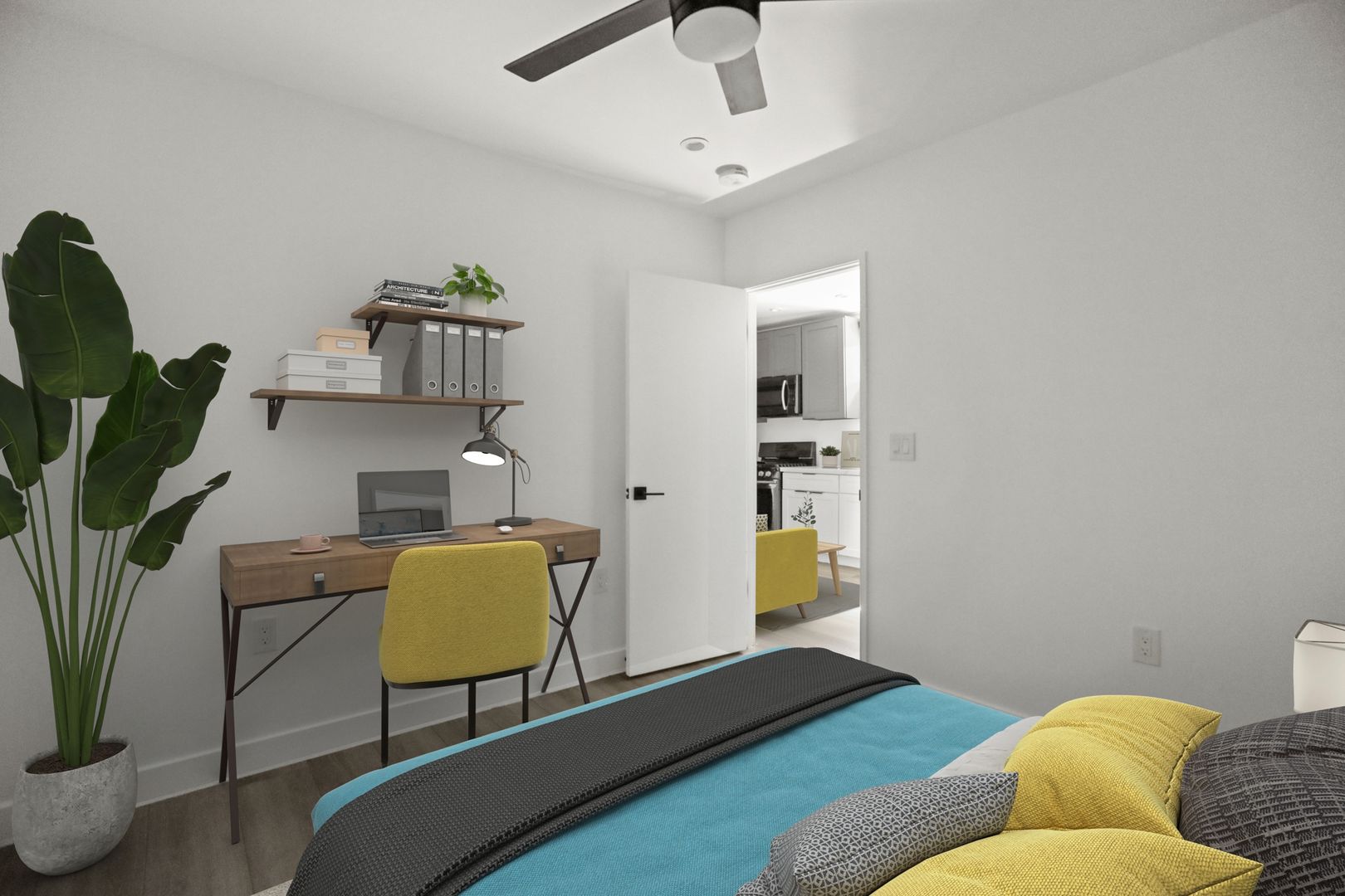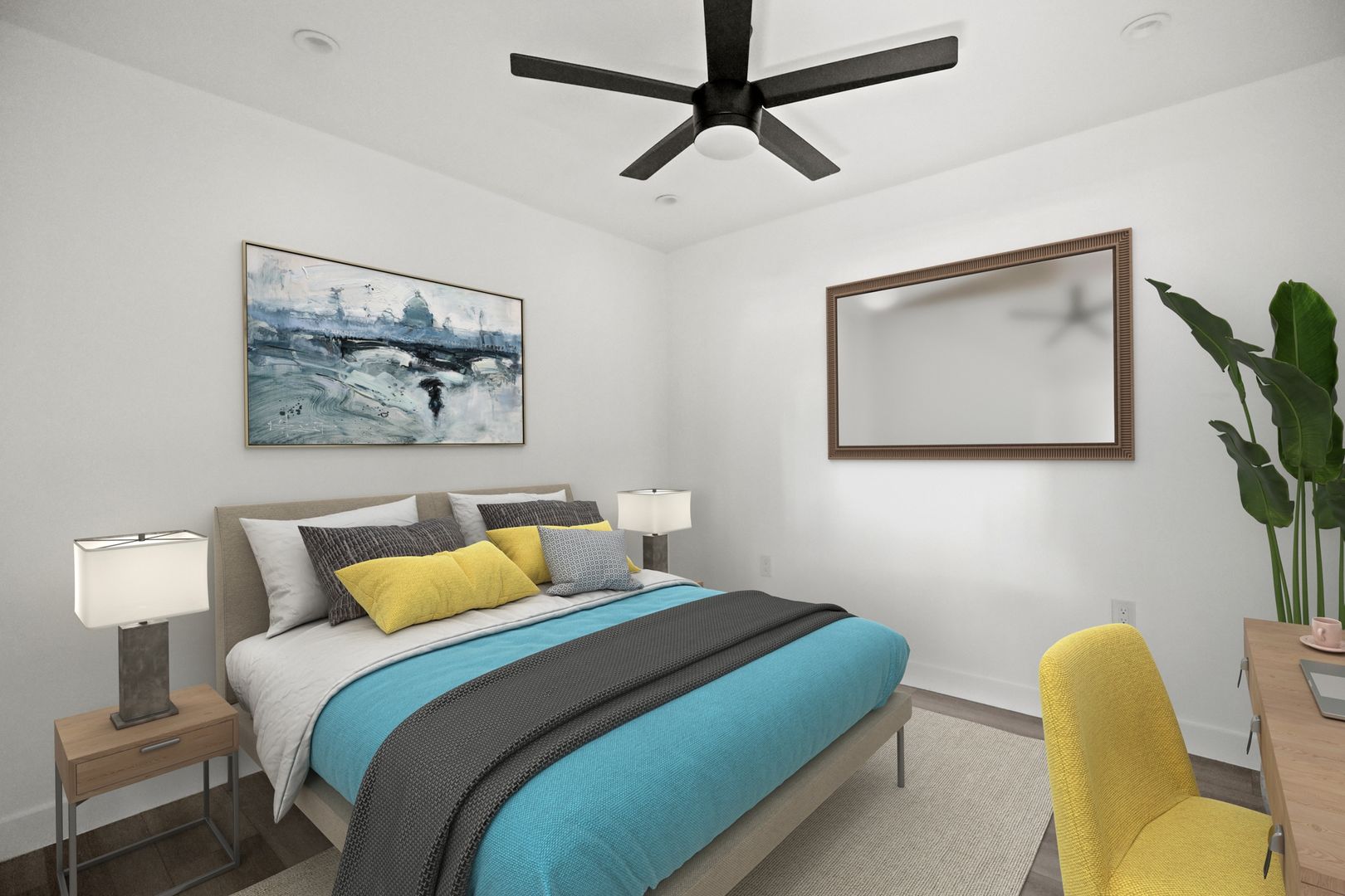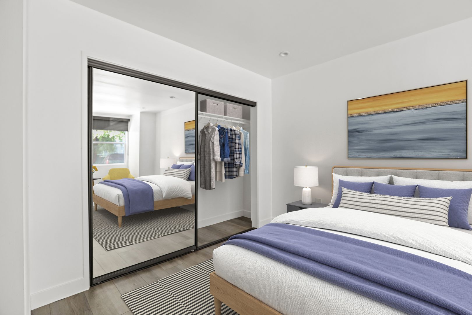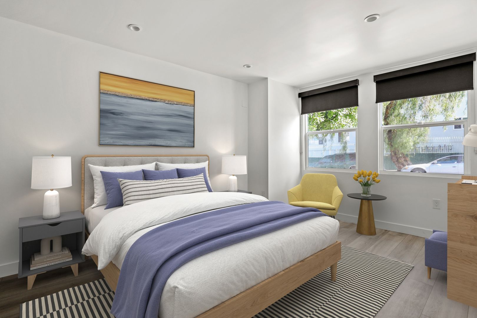 Carefully restored and designed by a renowned LA designer, these 1920s modern rental homes feature keyless entry door locks to spacious two-bedroom floor plans with new kitchens and bathrooms. The kitchen boasts sparkling white stone quartz countertops with brand new self-closing cabinetry and high-end stainless-steel refrigerators with matching gas cooktop with oven and microwave. iRing doorbells with a smart home video security camera are also included. Bathrooms feature porcelain tiled bath tubs and glass shower doors. Each rental home also includes central A/C cooling and heating with recessed lights with luxury style cellular shade window blinds, distressed wood plank floors, and dual sliding barn doors.