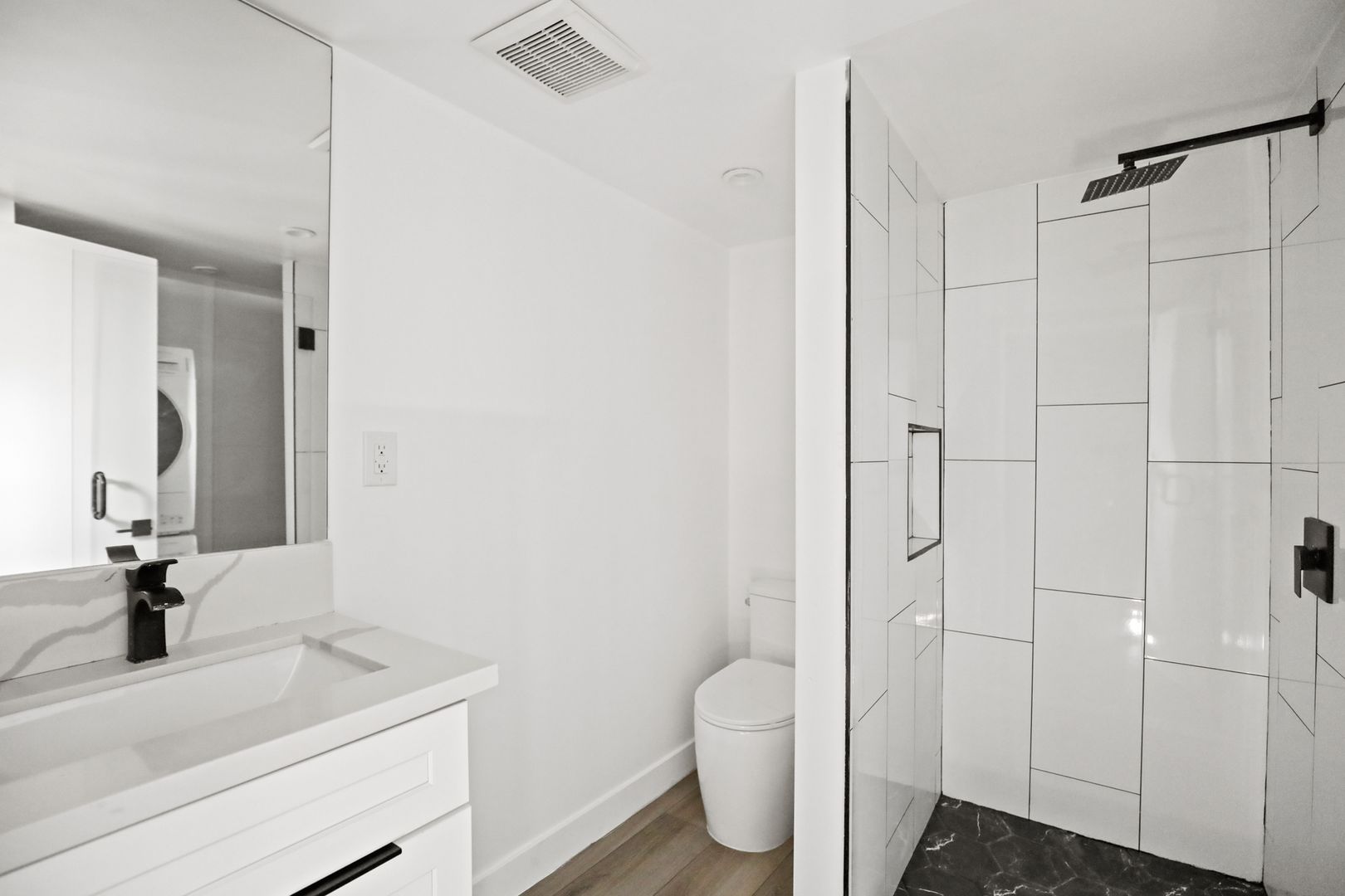 | BATH | - Tiled Shower and Bath - Glass Shower Doors - Oversized Vanity Mirror