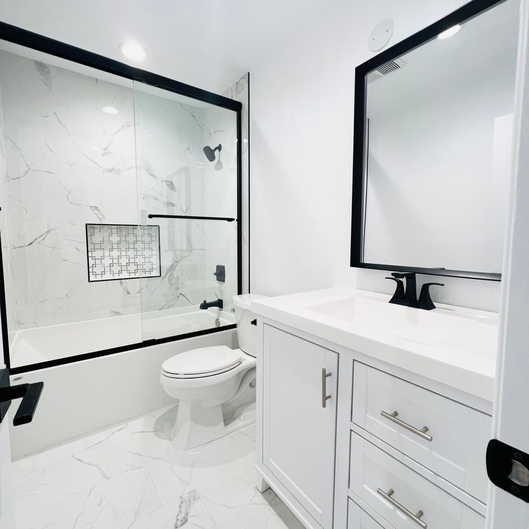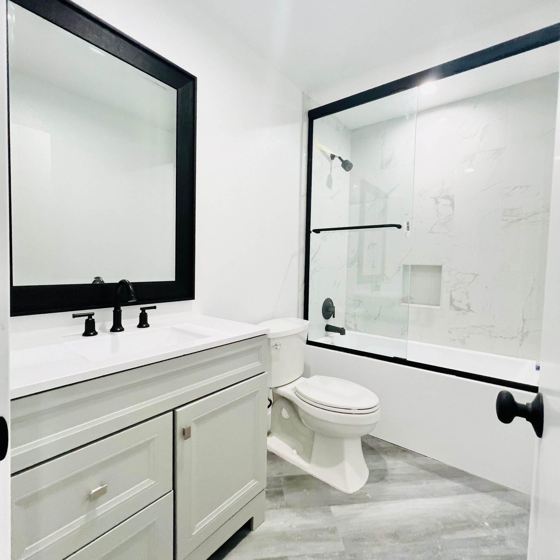 | BATH | - Tiled Shower and Bath - Glass Shower Doors - Oversized Vanity Mirror