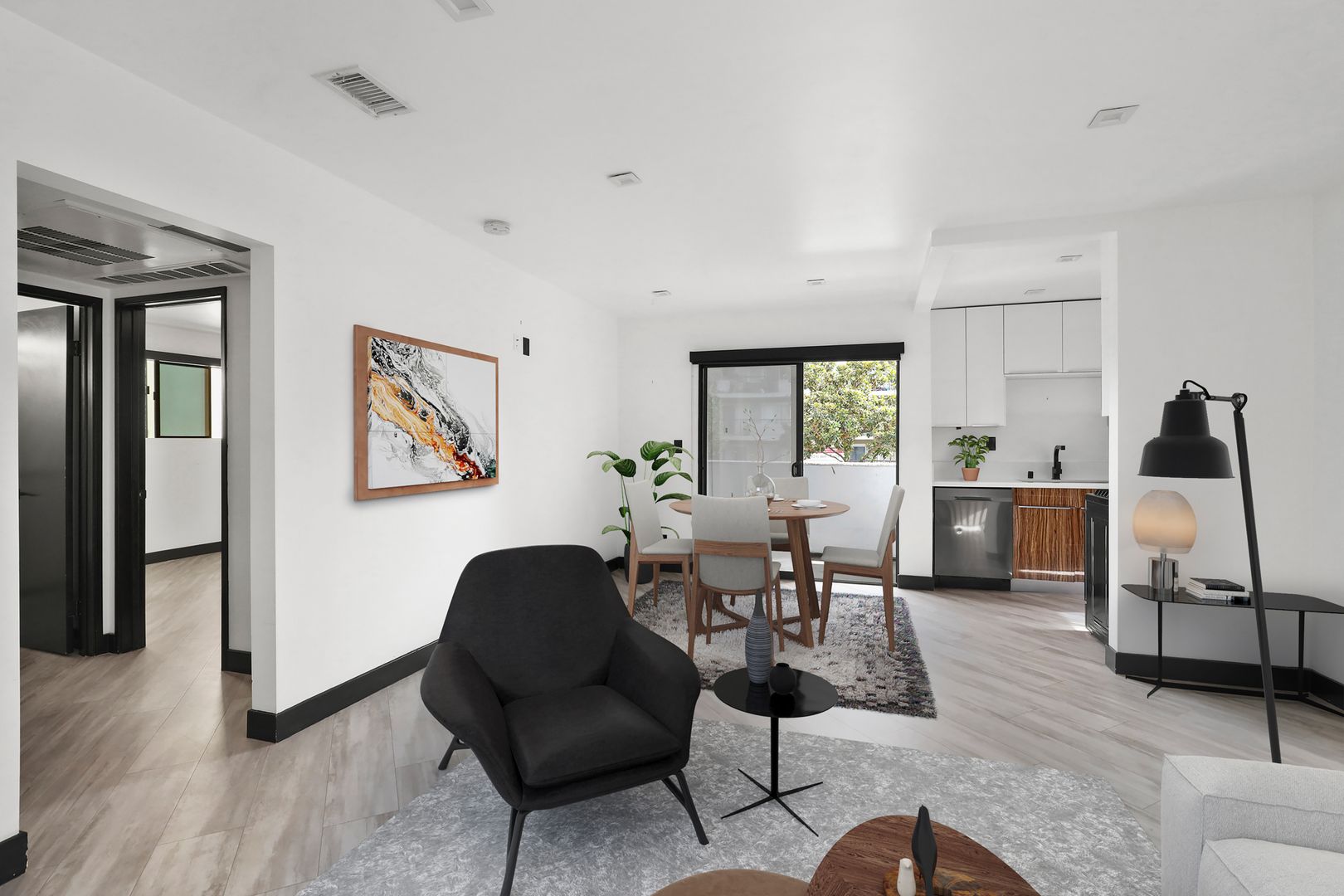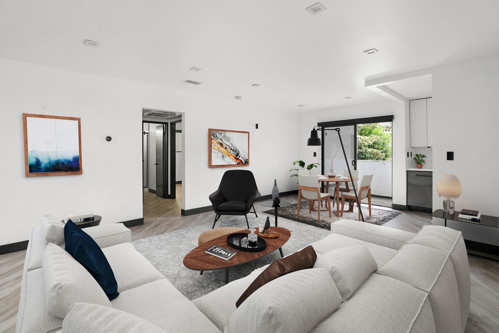 Inspired by midcentury Modernism architecture, these newly renovated rental homes in Hollywood are just minutes to the new Netflix corporate headquarters, the Sunset Bower studios, and the Sunset Gower studios. The thriving Downtown Los Angeles is just minutes away on the nearby 101 Freeway. 5667 La Mirada Avenue, located in the heart of central Los Angeles in the Hollywood Studio District neighborhood, features a nine-unit, two-story low-rise building with enhanced modern architecture and a gray cement shade base and accents of earth tone colors.