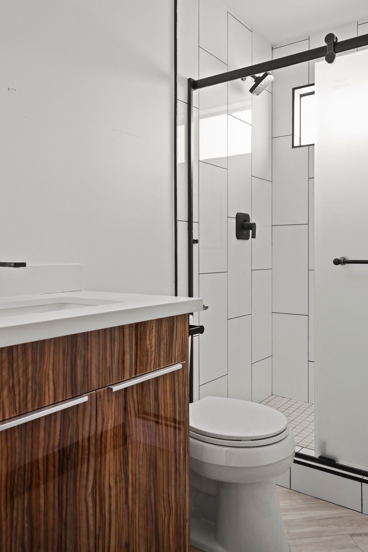 | BATH | - Tiled Shower and Bath - Glass Shower Doors - Oversized Vanity Mirror