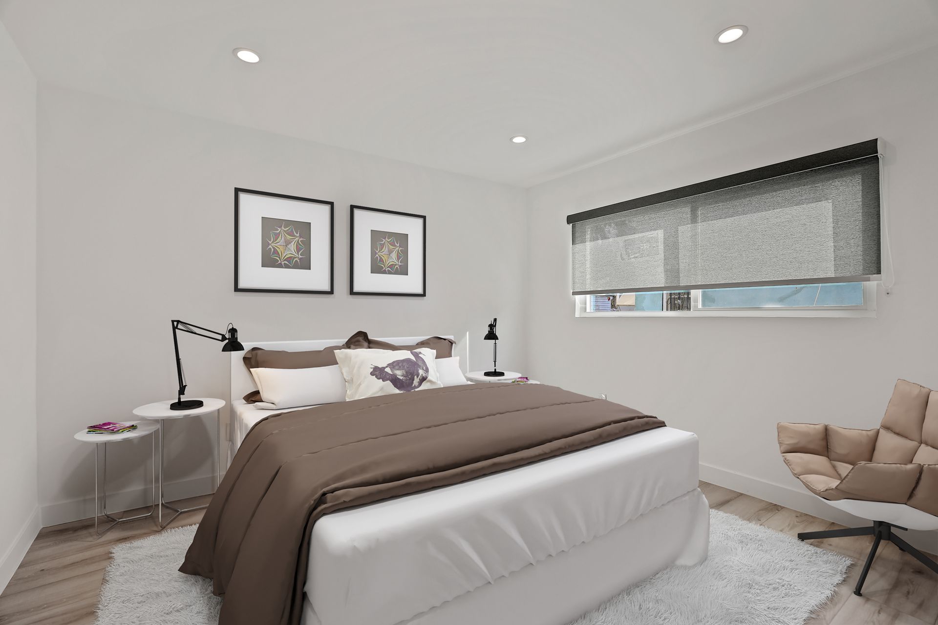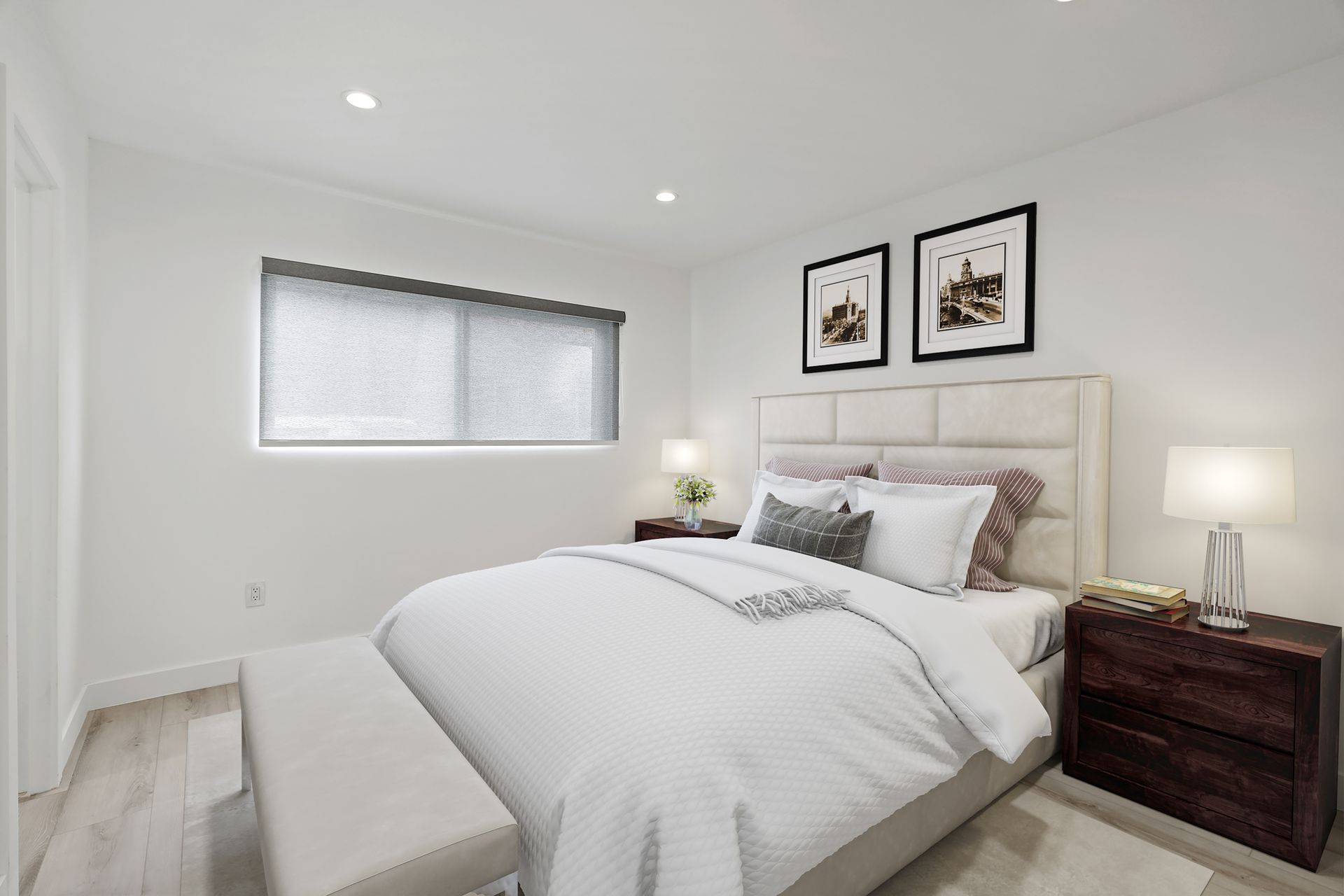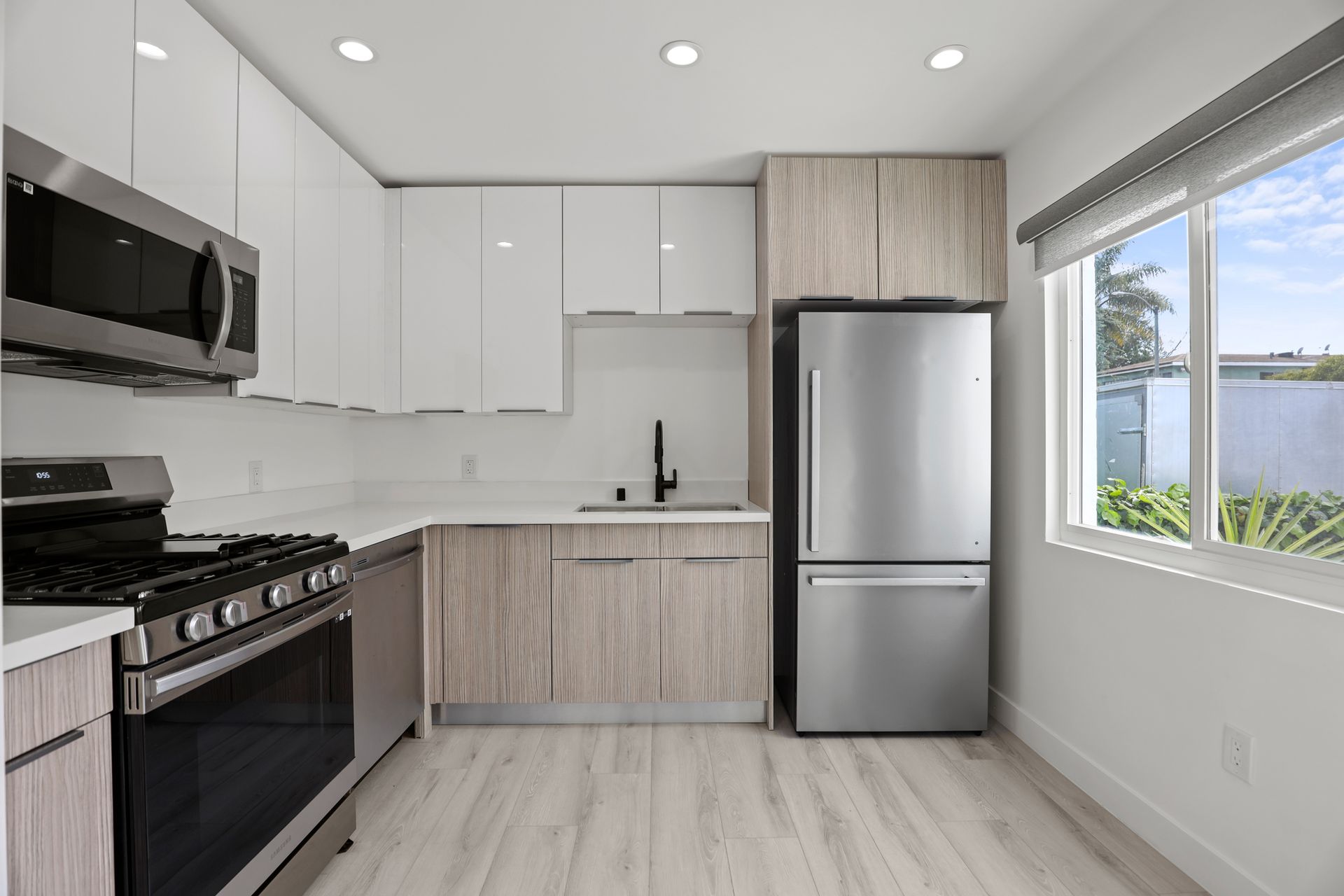 Carefully restored and designed by a renowned LA designer, these mid 1960s vintage luxury three bedroom rental homes feature keyless entry door locks to spacious floor plans with entry ways to newly renovated kitchen and bathrooms. The kitchen boasts sparkling white stone quartz countertops with brand new self-closing cabinetry and high-end Samsung stainless-steel refrigerators with matching gas cooktop with oven and microwave. Porcelain tiled bathtubs, and glass shower doors and separate guest bathrooms. Each rental homes also includes recessed lights with luxury style remote control blinds and distressed wood plank floors. And all units have a large patio or balcony with on-site parking.
