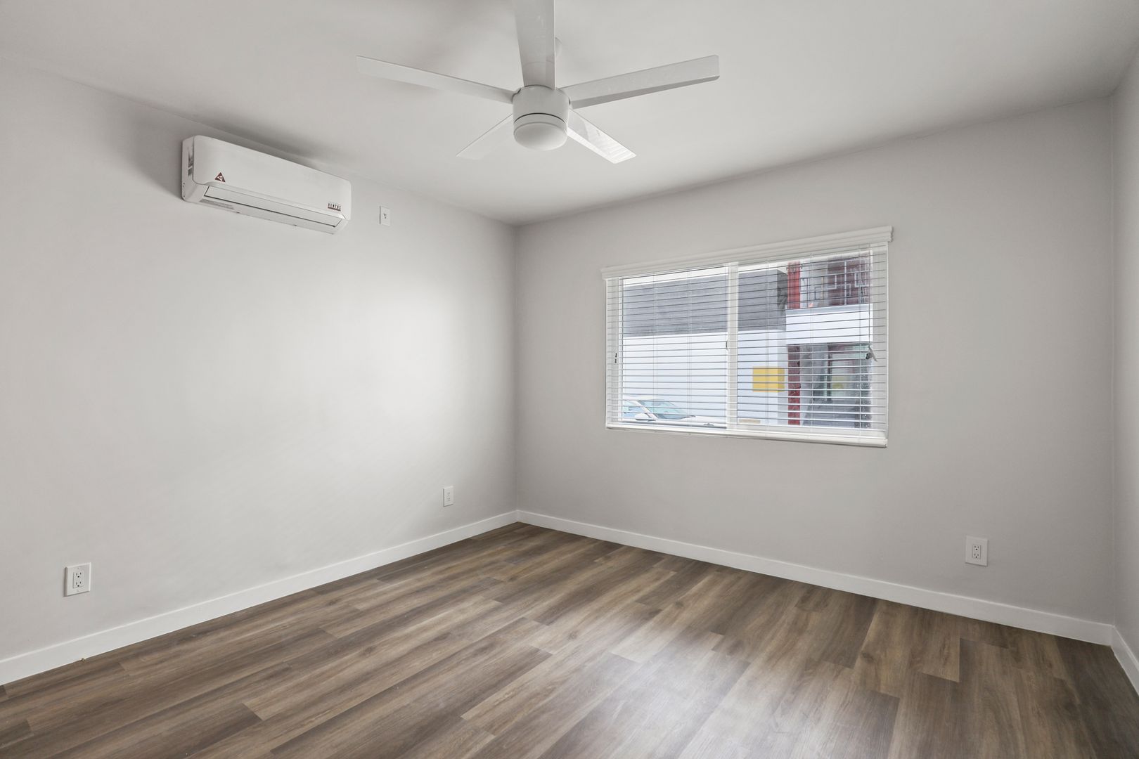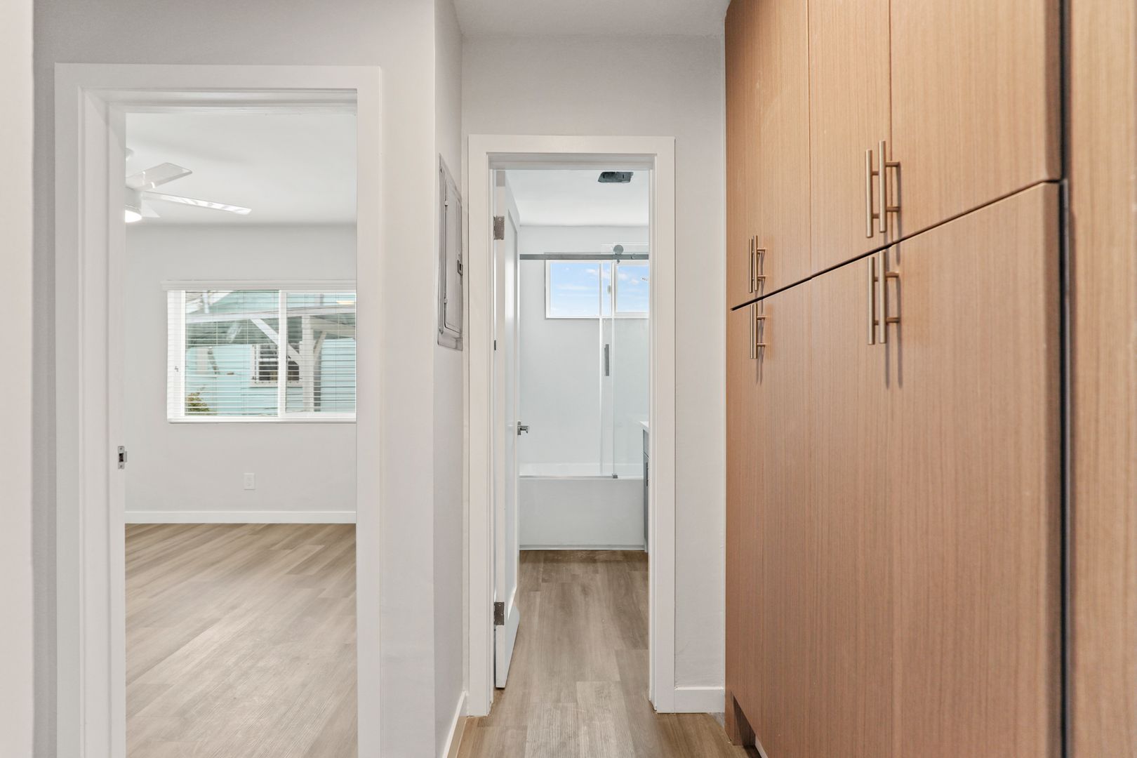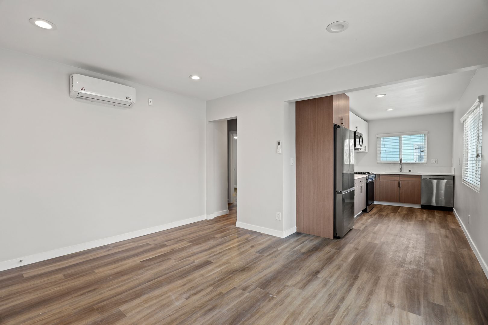 Carefully restored and designed by a renowned LA designer, these 1960s modern luxury rental homes feature keyless entry door locks to spacious one and two-bedroom floor plans with newly renovated kitchen and bathrooms. The kitchen boasts sparkling white stone quartz countertops with brand new self closing cabinetry and high-end stainless-steel refrigerators with matching gas cooktop with oven and microwave. iRing doorbells with a smart home video security camera are also included Bathrooms feature porcelain tiled bath tubs and glass shower doors. Each rental home also includes central A/C cooling and heating with recessed lights with luxury style cellular shade window blinds and distressed wood plank floors.