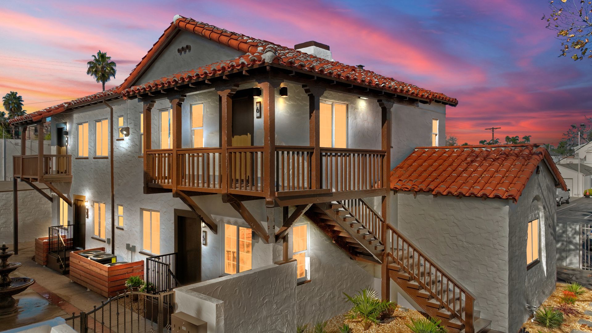 Inspired by Mediterranean and Spanish Revival-style architecture and enhanced by deep red tones and polished wood textures that contrast with stark white walls, these classic restored Santa Barbara-style rental homes are just minutes to thriving Downtown Santa Ana. 1524-1530 North Sycamore Street, located in the heart of Santa Ana’s historic Willard neighborhood, features two side by side, four-unit, two-story low-rise buildings with Santa Barba style architecture. This charming, gated community features a calming water fountain in the courtyard, private entryways, balconies, red tile roofs, and remote-controlled garage parking.