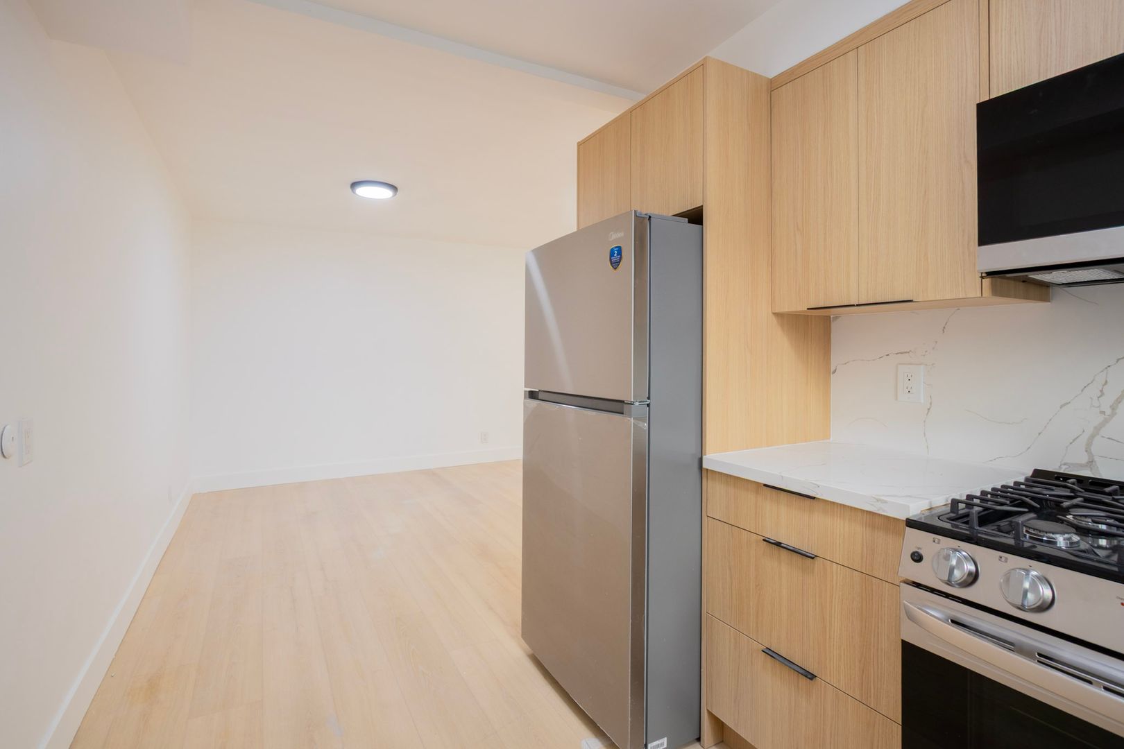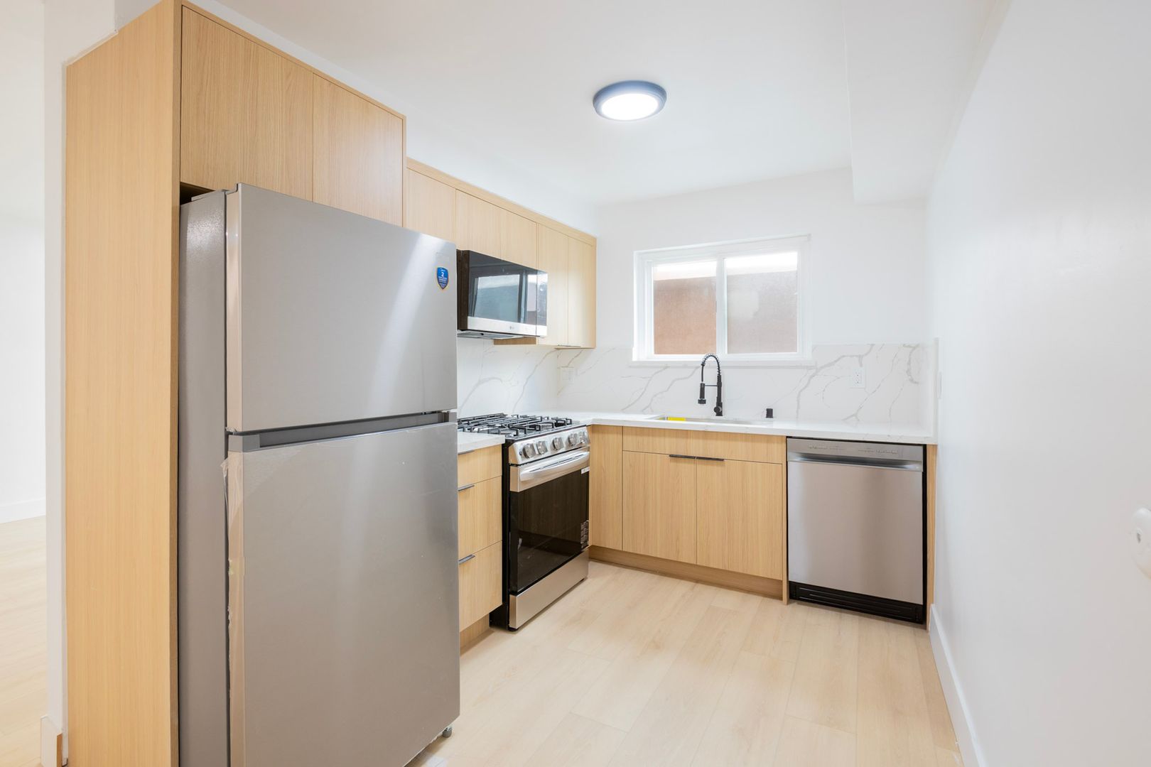 Inside, you’ll find a bright and well-designed layout featuring new flooring, contemporary lighting, and a clean, modern aesthetic throughout. The kitchen is equipped with brand new stainless steel appliances, sleek cabinetry, and updated countertops, creating a functional and stylish space for everyday living. The bedroom is spacious with ample closet space, while the bathroom has been fully renovated with modern tilework and fixtures.