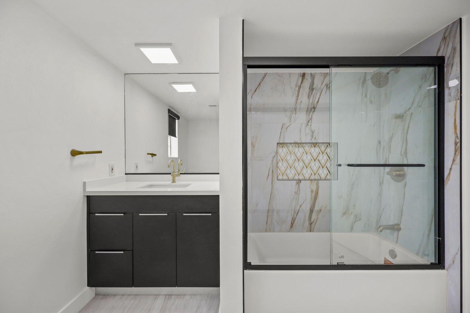 | BATH | - Tiled Bathroom Shower and Bath - Glass Shower Doors - Oversized Vanity Mirror